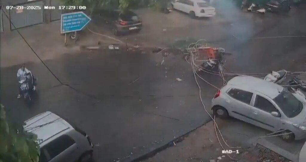 ही संपूर्ण घटना जवळच्या सीसीटीव्ही कॅमेऱ्यात कैद झाली आहे. व्हिडीओमध्ये स्पष्टपणे दिसते की स्कूटरवरून जाणाऱ्या महिलेवर विजेचा खांब कोसळतो. कोसळतानाच खांबातील तारांमधून ठिणग्या उडताना दिसतात. महिला काही वेळ पोलखाली अडकलेली दिसते, पण काही क्षणातच स्थानिक नागरिक घटनास्थळी धाव घेतात आणि मदत कार्य सुरू करतात.